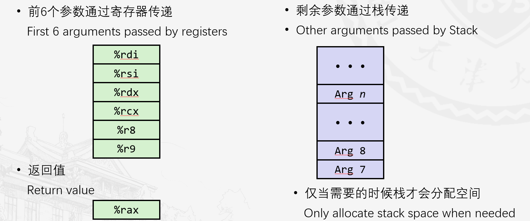 在x86-64中,最多可以使用6个寄存器传值,如果多于6个,那么剩余的参数被存储在栈上,这个部分称为栈帧,假设有n个参数传递,那么7~n个参数就在栈帧里面,并且参数7位于栈顶,之后便可以执行call指令了。