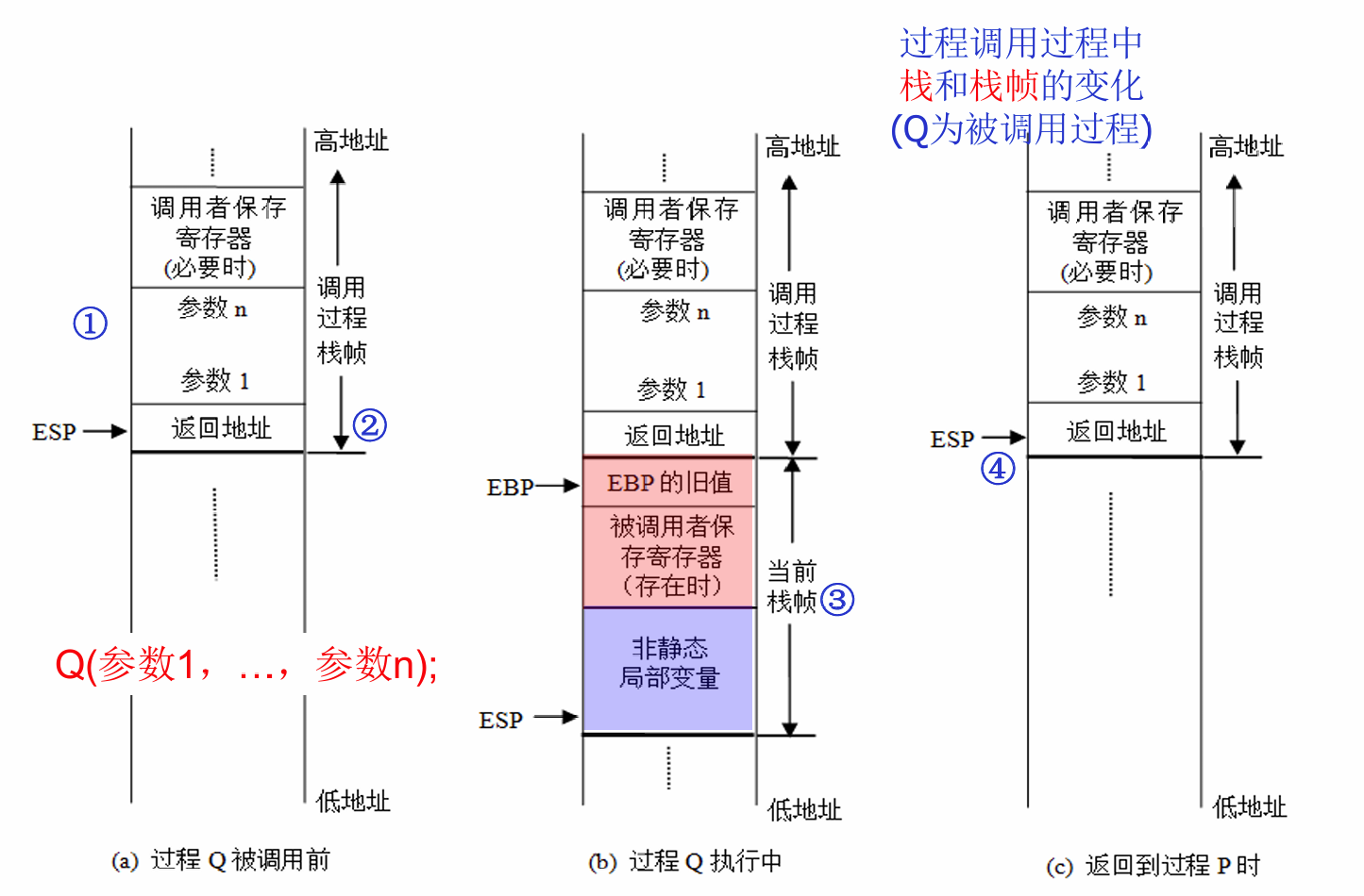 如图所示,每个函数开始时执行push %ebp为了保存ebp旧值,而movl esp ebp指令则是把esp栈指针赋给了ebp,这样ebp就指向了另一个新的栈帧,由于push的时候,esp向下增长减四,那么现在这个ebp正好在ebp旧值的起始字节位置,函数内部通过