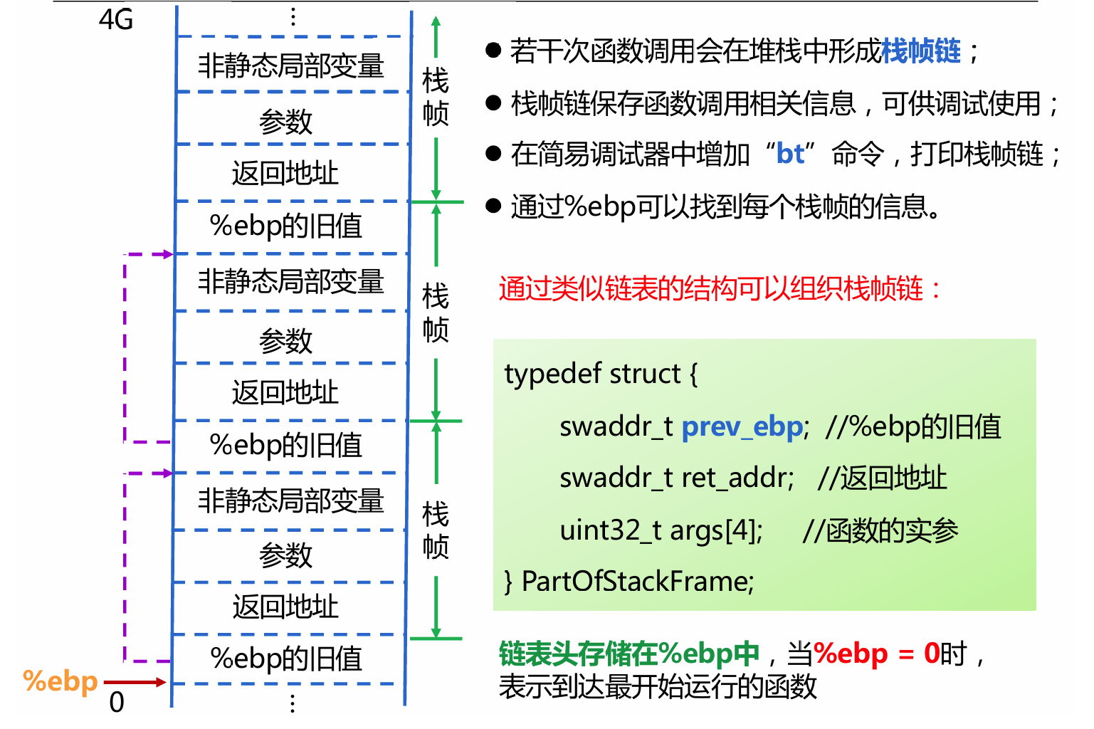 对于EBP这个寄存器,非常特殊,每次调用函数,被调用函数都要储存它,就是先push它,所以,在程序执行到某一步停止的时候,我们可以直接在栈里面寻找这个EBP,存的就是EBP的旧值。而这个旧值,就是调用现在EBP所在的函数的那个函数的栈帧里面,因此,这就像一个链表,从EBP一次一次到最初的那个函数,这就是栈帧链,反应的是函数的调用关系。