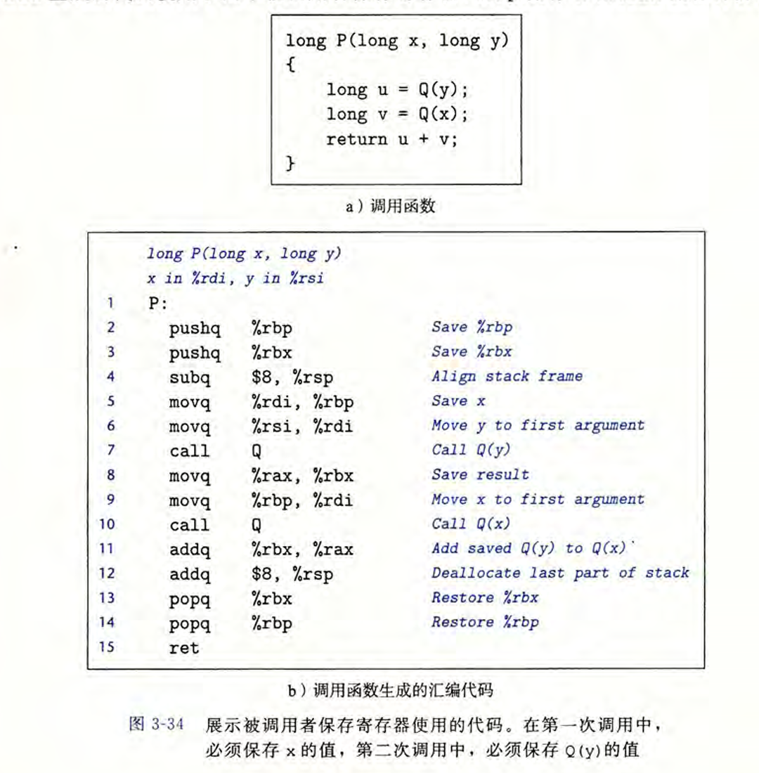 这里再强调一下,可能你看了书的173页的例子以后可能会有一点疑问,那个汇编语言的第五行,把x存入了RBP中,明明RBP中应该全是地址才对。但是实际上这种情况也可以,因为有些函数调用比较简单,根本不用开栈帧,在这种情况下(所有的局部变量 都可以保存在寄存器中,而且该函数不会调用任何其他函数,有时被称为叶子过程),RBP根本不会在调用的Q函数里面push,因此可以放心。