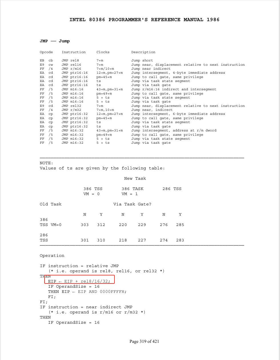我犯这个错误是因为i386手册里,我误以为eip是当前指令的地址,而不是下一套指令。