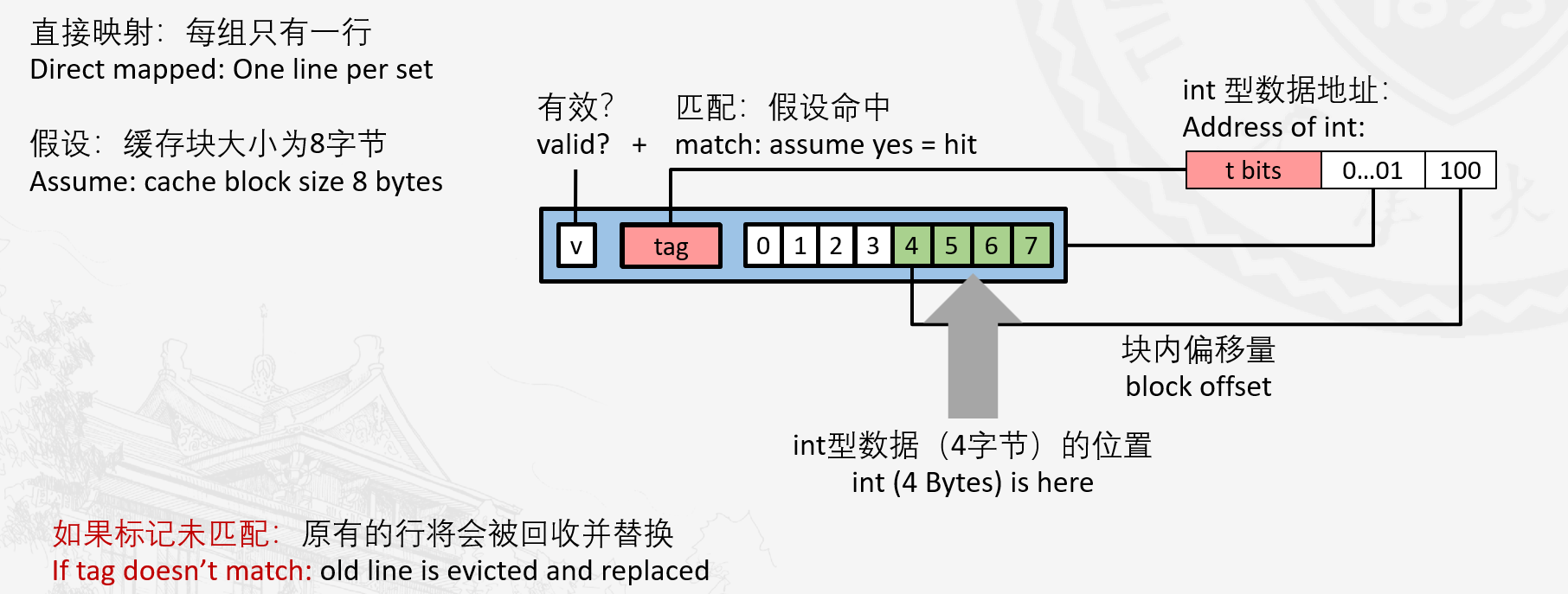 由于直接映射高速缓存只有一行,那么行匹配会非常容易,只有有效位被设置,且tag也匹配时,才命中。