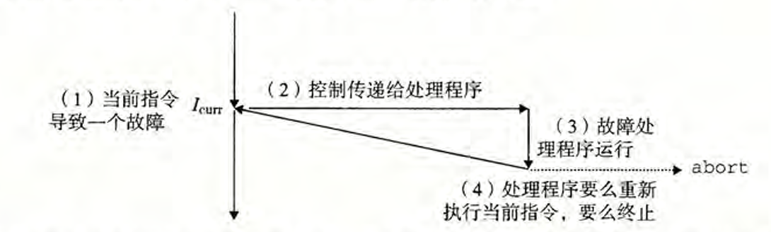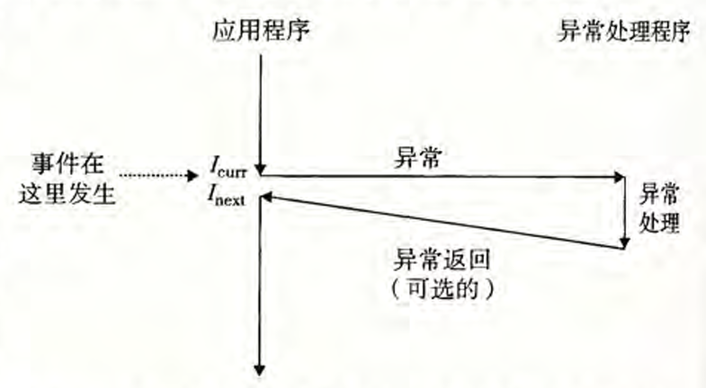 如图,当处理器状态发生某种重要的变化时,此时处理器中正在执行当前指令$I_{curr}$,状态变化(被称为事件)之后,跳转到某个地方进行异常处理,完成之后有三种可能:
