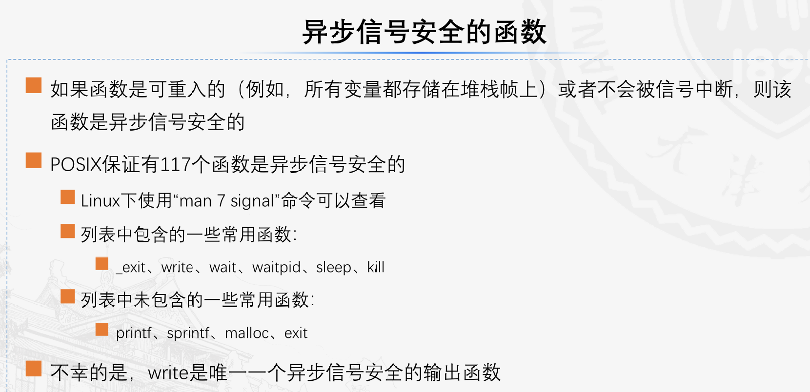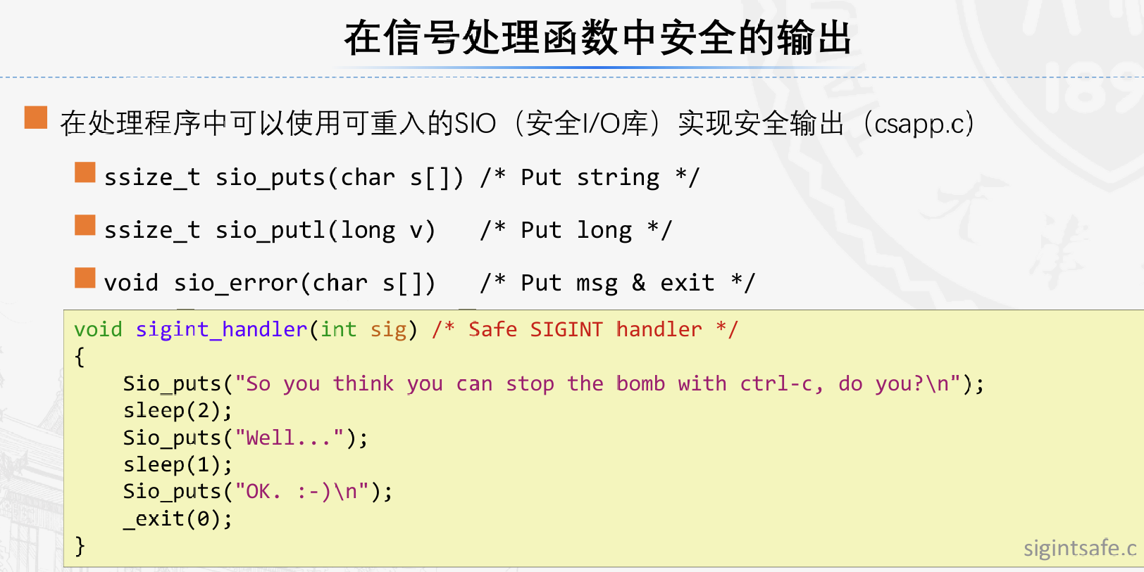 sigsetjmp和siglongjmp函数不属于异步信号安全的函数。原因是一般来说siglongjmp可以跳到任意代码,所以我 们必须小心,在siglongjmp可达的代码中调用安全的函数。在本例中,我们调用安全的 sio_puts 和 sleep函数。不安全的 exit函数是不可达的。