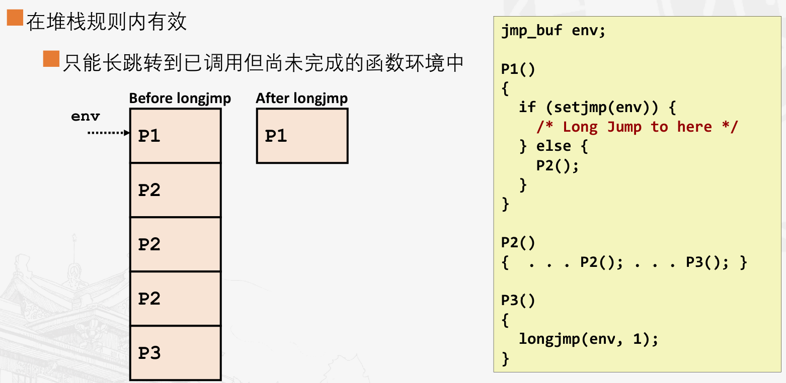 非本地跳转的限制:只能跳转到已经调用,没有返回的函数环境中。