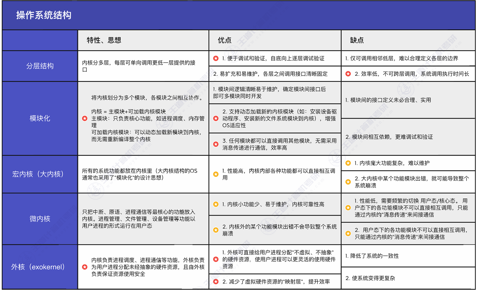 我们把早期的无结果的OS(第一代)、模块化结构的OS(第二代)和分层式结构的OS(第三代),都统称为传统结构的OS,而把微内核结构的OS称为现代结构的OS。