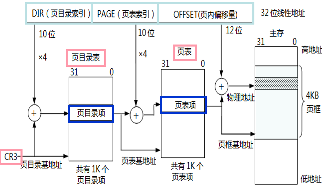 线性地址由3个字段组成,分别是10位页目录索引,10位页表索引,12位页内偏移