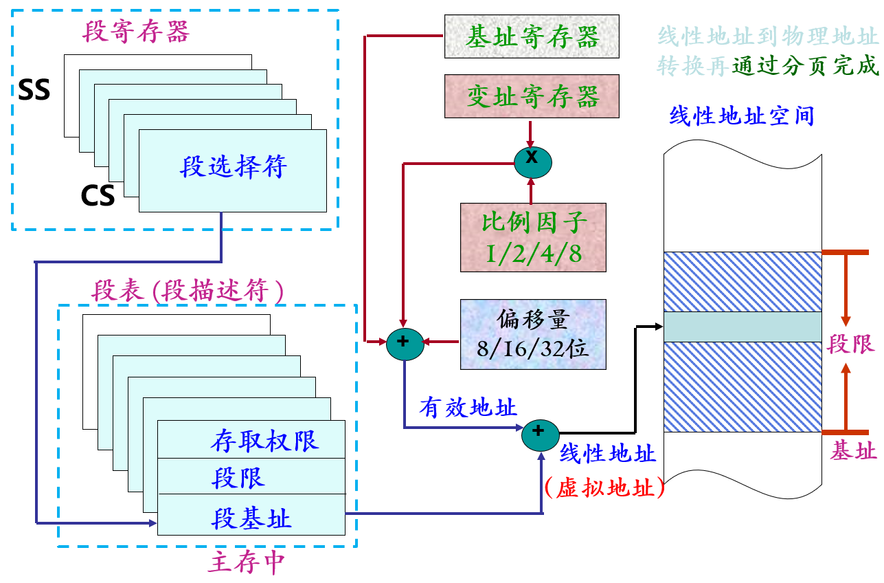 在计算线性地址的过程中,可根据段描述符中的限界和访问权限判断是否“地址越界”或“访问越权”,以实现存储保护