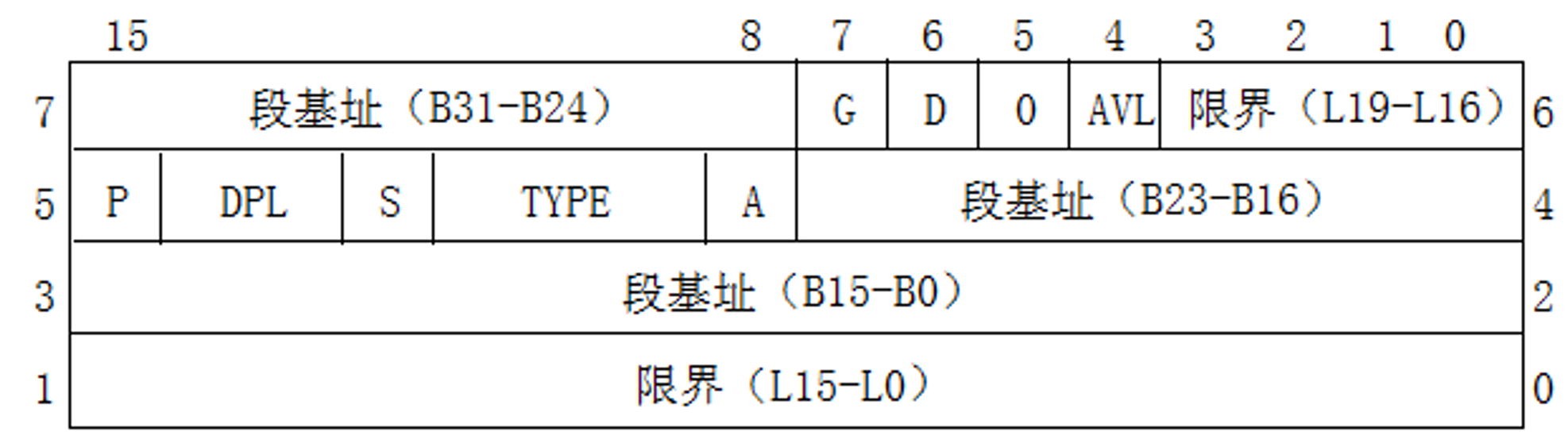 ——把内存中的某一连续空间解释成一个数组,称为段描述符表,数组中每个元素对应一个段描述符,段寄存器存放数组下标,段描述符表基地址用另一个寄存器