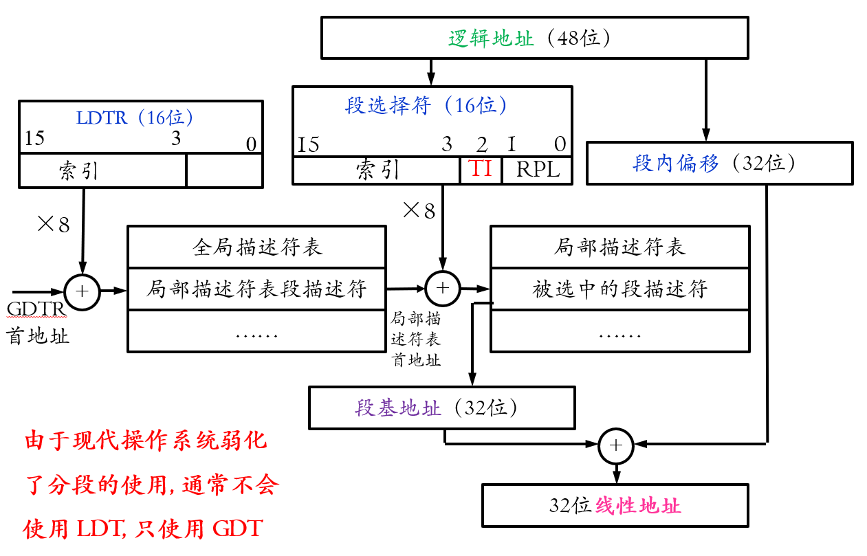 4.在段描述符中读出段的基地址,和逻辑地址相加,得到线性地址。