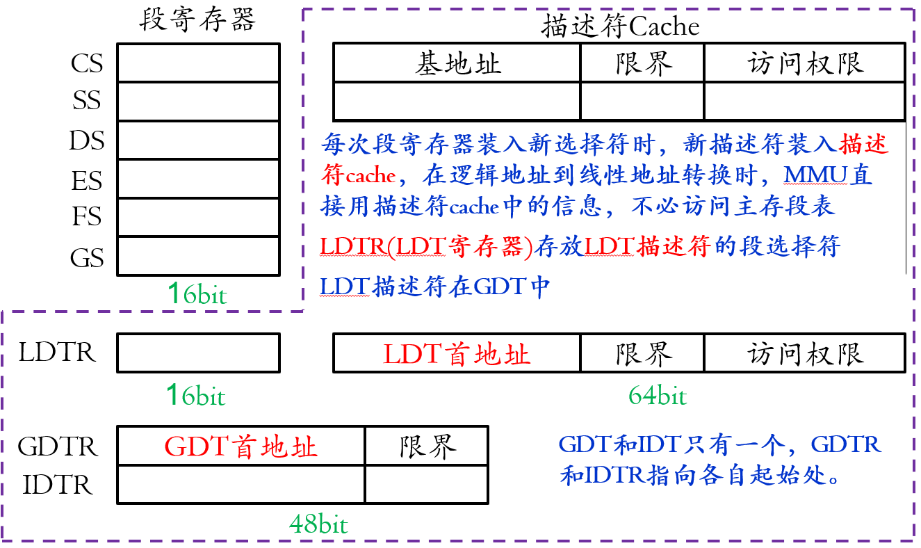 虚线框内的对用户不可见,仅可通过OS内核调用特权指令对GDTR,LDTR和IDTR进行读写