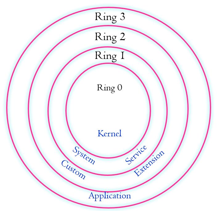 在80386中,存在0~3四个特权级别,0特权级最高,3特权级最低。特权级n所能访问的资源,在特权级0~n也能访问。不同特权级之前的关系就形成了一个环