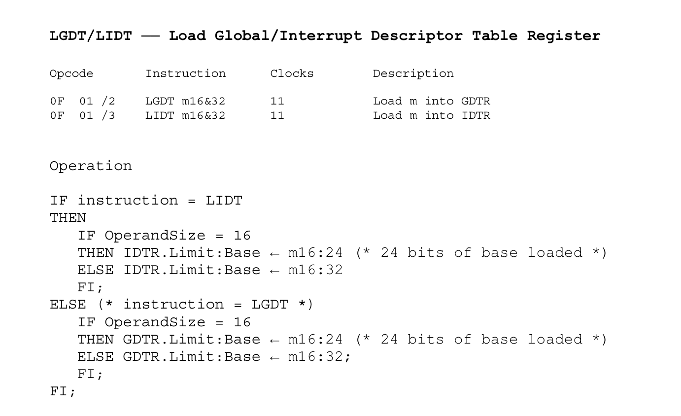// 16位操作数:16bits limit + 24bits base | 2+3 Bytes