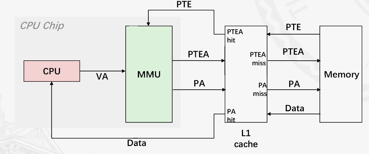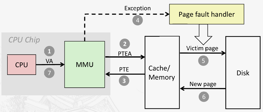 虚拟内存系统必须有某种方法来判定一个虚拟页是否缓存在 DRAM中的某个地方。如果是,系统还必须确定这个虚拟页存放在哪个物理页中。如果 不命中,系统必须判断这个虚拟页存放在磁盘的哪个位置,在物理内存中选择一个牺牲页,并将虚拟页从磁盘复制到DRAM中,替换这个牺牲页。