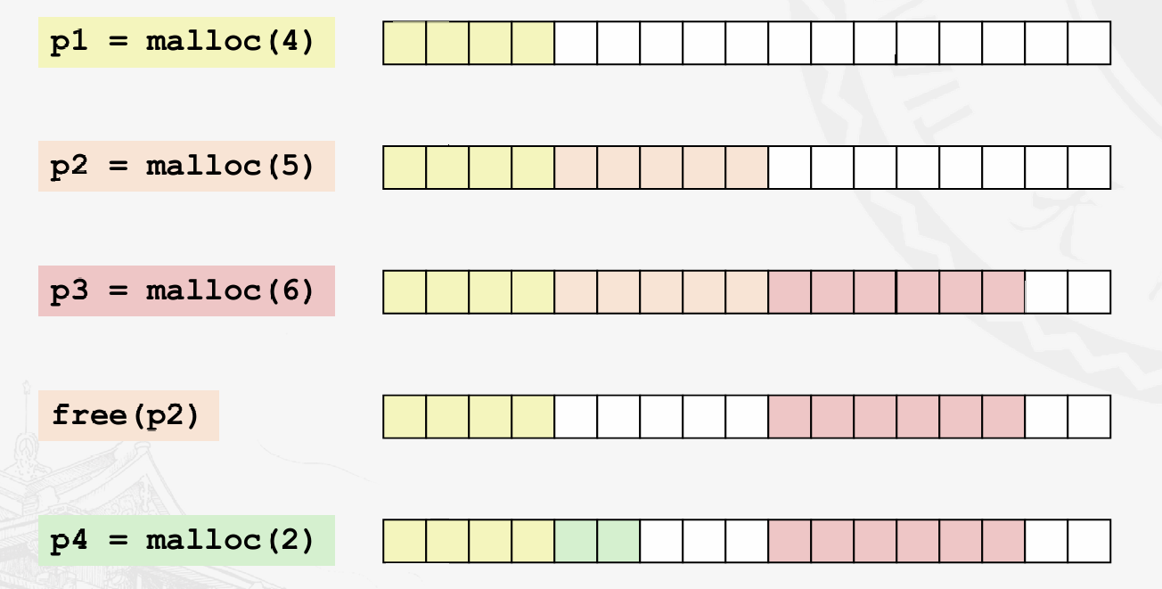 为了分配大小为n 的块:在适当的空闲链表中搜索大小为m > n 的块,如果找到合适的块,分配空间,将剩余的空闲部分,放置在适当的链表中(可选)。如果未找到块,则尝试下一个更大的类别