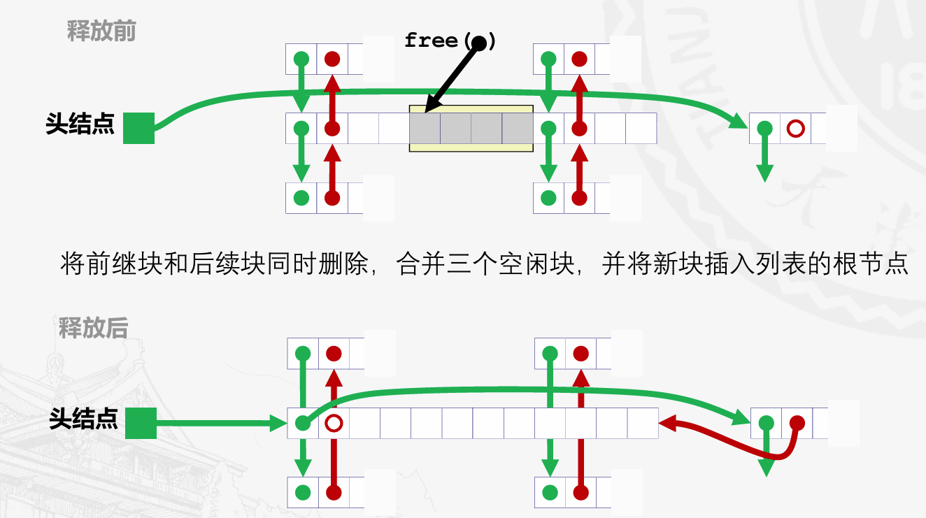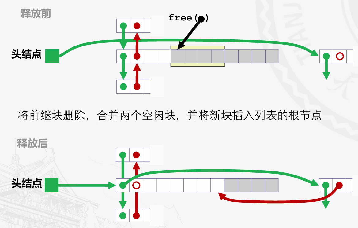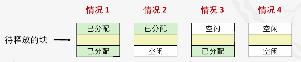 按地址顺序:插入释放的块,使得空闲列表块始终按地址顺序排列:addr(prev) < addr(curr) < addr(next)