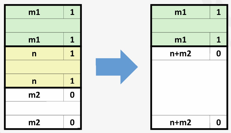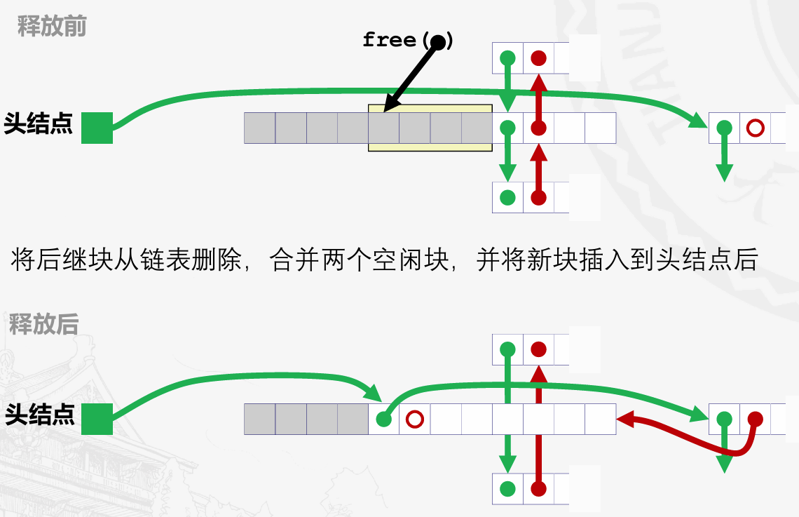 为了解决假碎片问题,任何实际的分配器都必须合并相邻的空闲块,这个过程称为合 并(coalescing)
