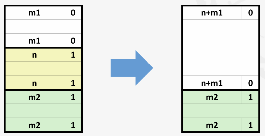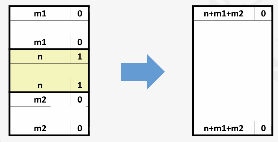 立即合并(immediate coalescing), 在每次一个块被释放时,就合并(常数时间完成)