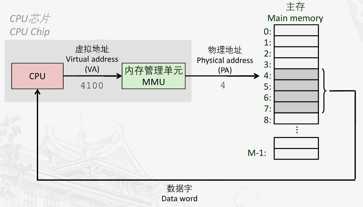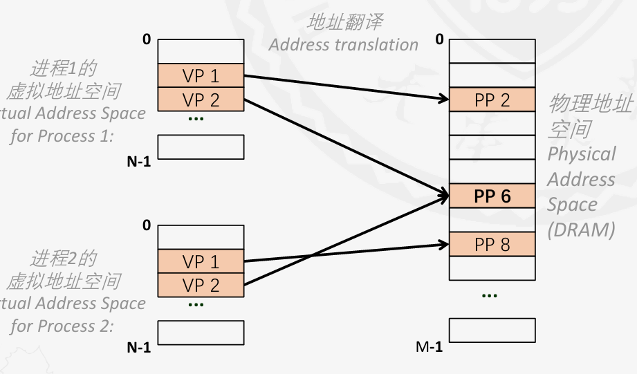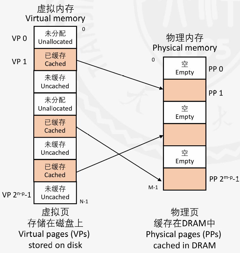 虚拟内存是一个包含N个连续字节的数组,可以被存储在磁盘上。磁盘上的数组被缓存在物理内存中(DRAM 缓存),这些缓存块被称为“页”(大小为P= 2^p字节)