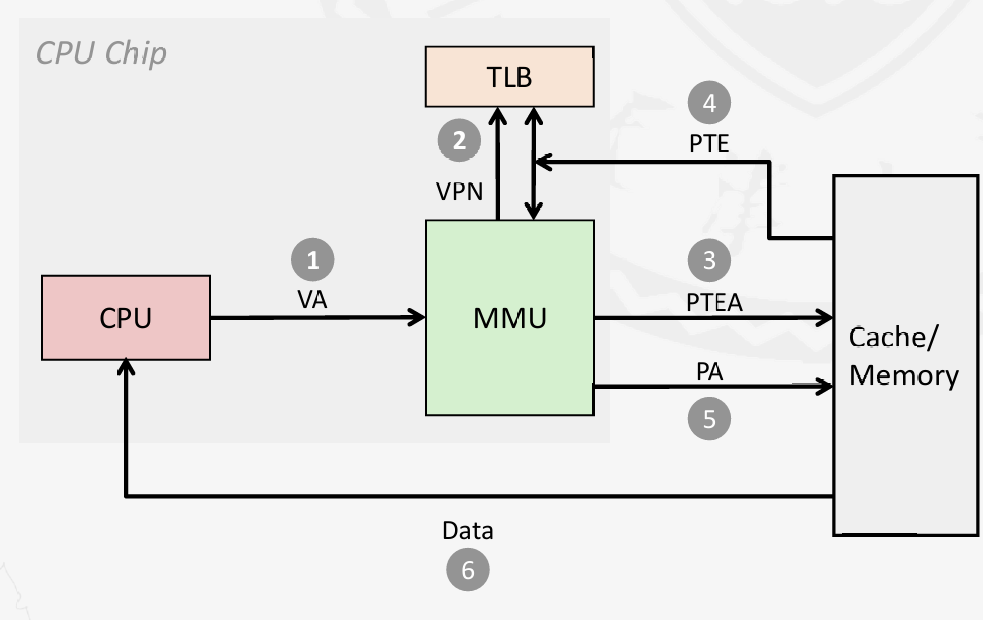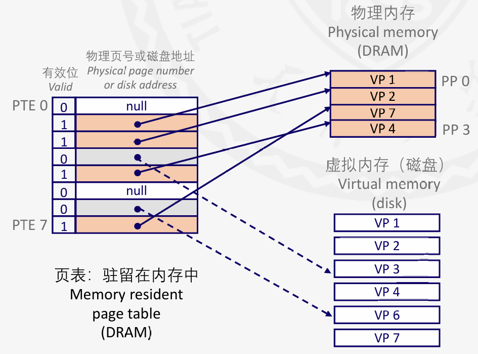 虚拟内存系统必须有某种方法来判定一个虚拟页是否缓存在 DRAM中的某个地方。如果是,系统还必须确定这个虚拟页存放在哪个物理页中。如果 不命中,系统必须判断这个虚拟页存放在磁盘的哪个位置,在物理内存中选择一个牺牲页,并将虚拟页从磁盘复制到DRAM中,替换这个牺牲页。