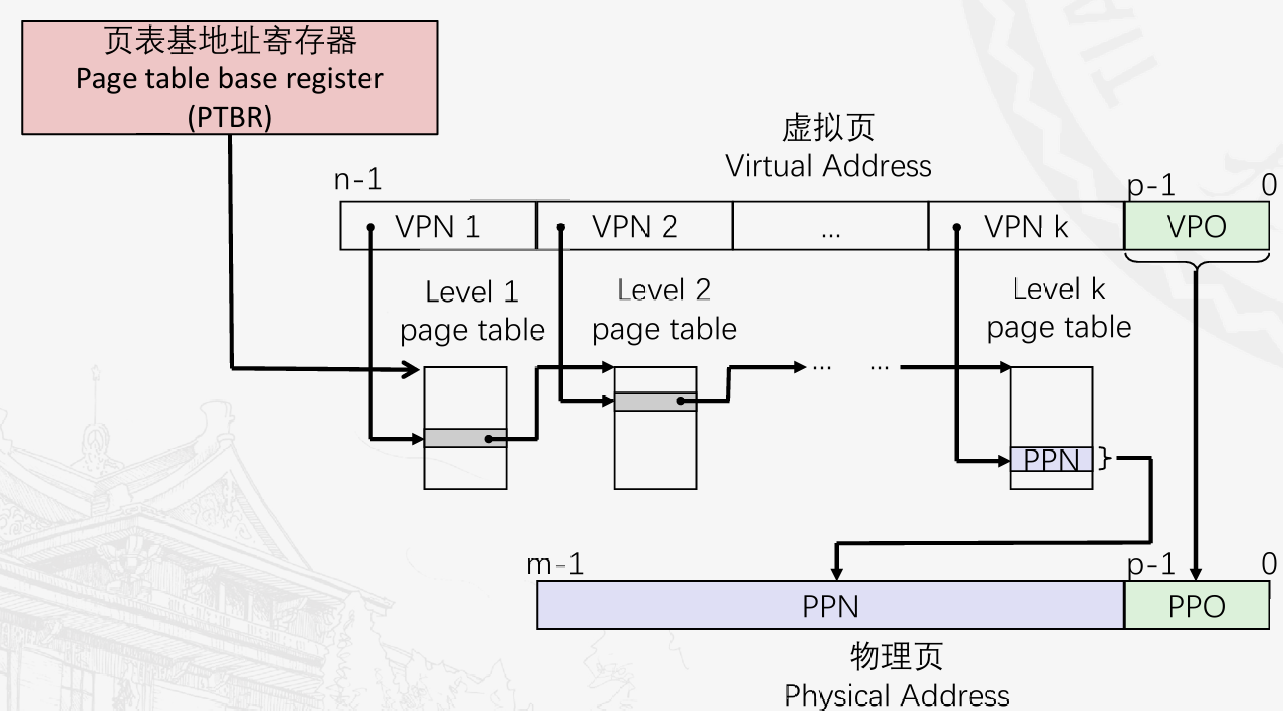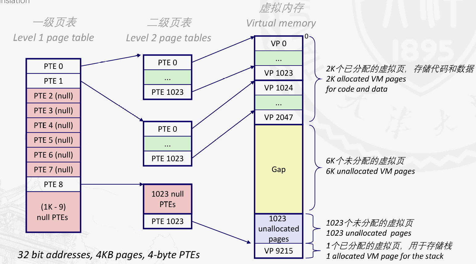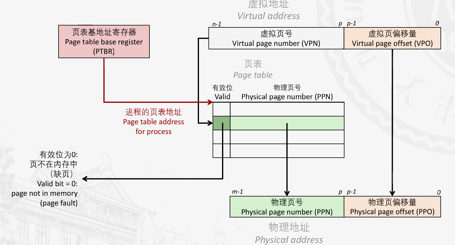 n 位地址字段:表示物理页号或磁盘地址,如果为NULL,表示未分配