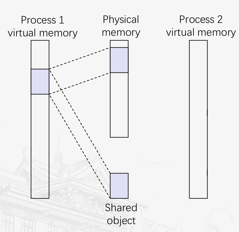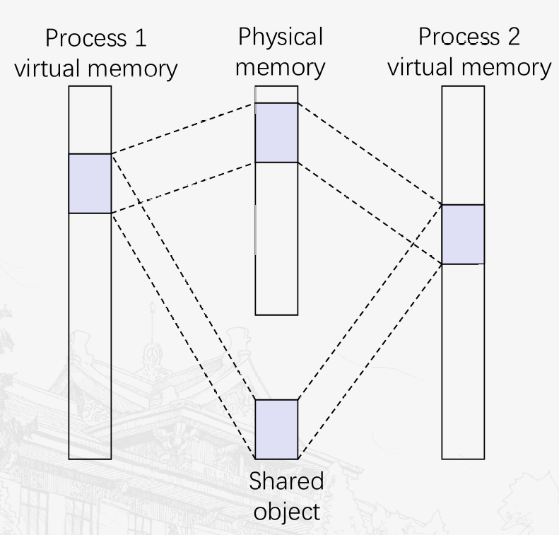 在一些情况中,需要进程来共享代码和数据。例如,每个进程必须调用相同的操作系统内核代码,而每个C程序都会调用C标准库中的程序,比如printf 。操作系统通过将不同进程中适当的虚拟页面映射到相同的物理页面,从而安排多个进程共享这部分代码的一个副本,而不是在每个进程中都包括单独的内核和C标准库的副本,