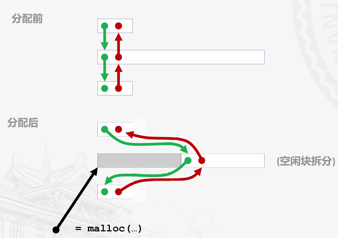 为了分配大小为n 的块:在适当的空闲链表中搜索大小为m > n 的块,如果找到合适的块,分配空间,将剩余的空闲部分,放置在适当的链表中(可选)。如果未找到块,则尝试下一个更大的类别
